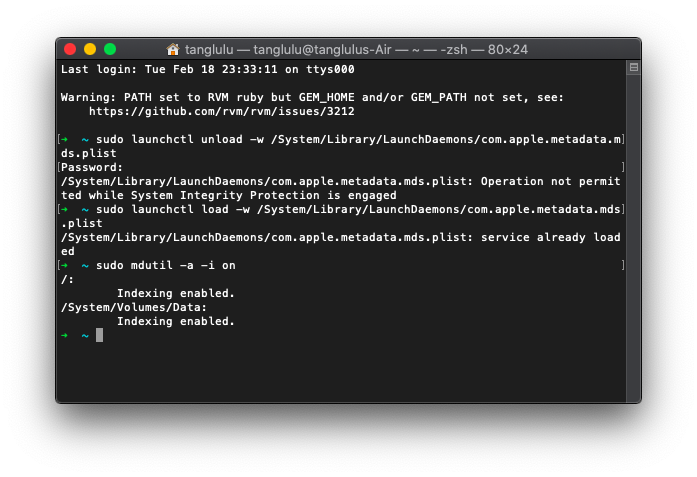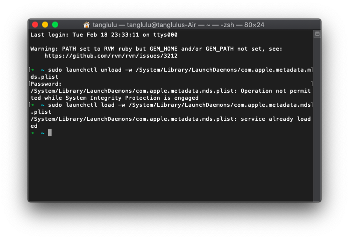 5. 继续输入sudo launchctl load -w /System/Library/LaunchDaemons/com.apple.metadata.mds.plist 点击回车