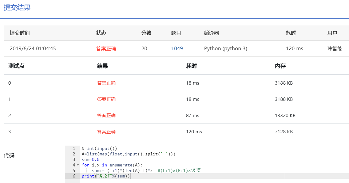 以上就是傻傻含羞草最近收集整理的关于1049 数列的片段和 (20 分) PAT乙级 Python3 6行解法1049 数列的片段和 (20 分)的全部内容,更多相关1049内容请搜索靠谱客的其他文章。