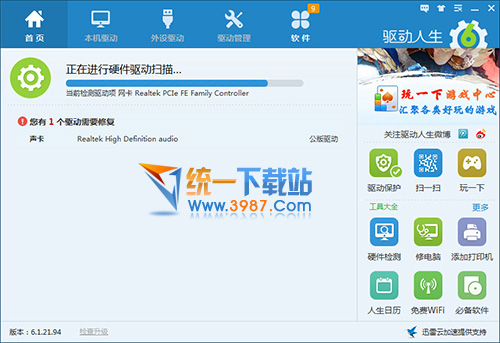 下载安装最新版驱动人生6,打开软件并点击立即检测,根据提示进行修复或重新下载安装声卡驱动即可。