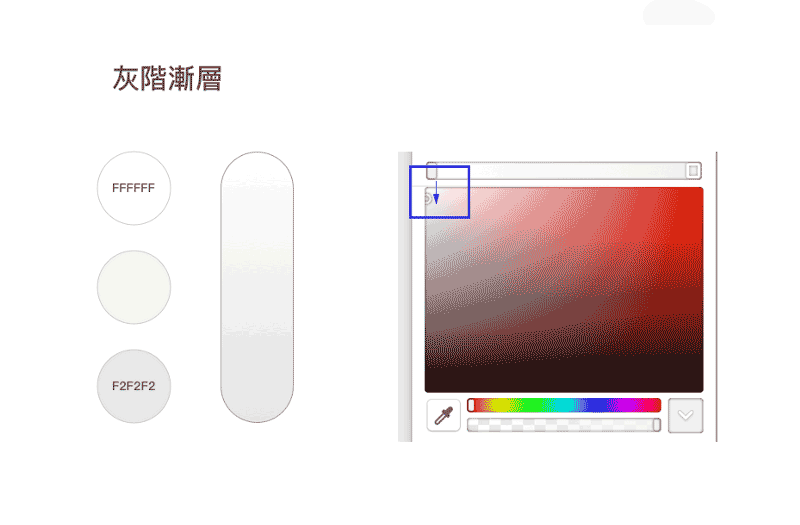 主要的调整就只在检色器的最最最最最左侧上下移动即可,如果希望带点淡淡的色泽可以往右边稍微移动一点点,这样的效果有时候会运用在物体本身是白色但周围是有色背景时,物体因为背景产生的反光影响到白色物品的表面色泽。如果希望整体给使用者的印象是清爽干净的,渐层中搭配的灰色就不应该太重,如示意图从白色往下调整一点点即可,若是选用深灰色来做搭配,产生的则是另一种沈稳的效果。