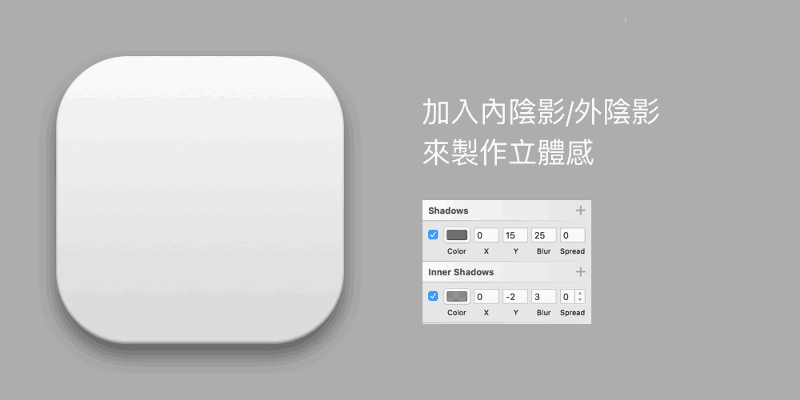 当然,上图几个示范的三维效果其实还不够完整,但以现在Flat Design盛行的状况,对于光于影的变化有一些基础的了解对于取悦团队中的设计师妹妹肯定是相当有帮助的(笑)。有了基本的视觉雏形,我们可以再进一步的进行渐层(渐层角度,渐层区段,内外光晕)的微调,同时考虑到光影的变化以及阴影的角度位置,就可以轻易的作出如下图范例的效果啰!(下图除了白 → 浅灰的渐层之外,为了做出凹陷的平面,同时也运用了浅黑 → 深黑的渐层变化)