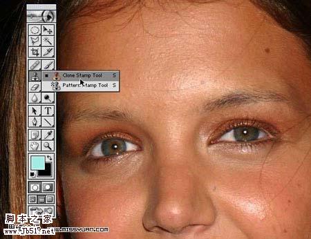 请仔细观察凯蒂眼周的皱纹,参照之前找到的老人的照片,想象出皱纹应该形成的方向和深度差异,然后应用【图章工具】和【画笔工具】相结合,增加它们的【长度】和【深度】,这里需要一些技术上的要求,而且还可以将皱纹延伸到额头和两颊的部分,嘴周围的部分也适当的添加写皱纹。