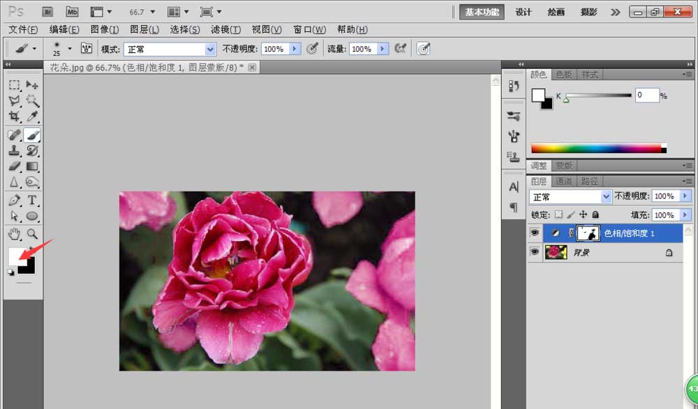 6、当选择前景色为白色的时候,图片中的调整的花朵颜色会随之进行变化,表示的是没有被遮住的图层,所以颜色才会进行调整,当已经被遮住的图层为黑色时候,那么颜色肯定是用画笔显示的是原有图片的颜色,这个是非常值得多去练习的。