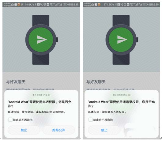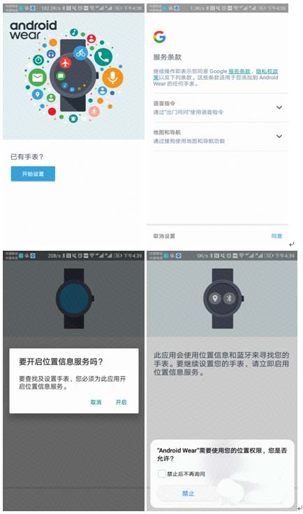 1、打开手机蓝牙功能,打开android wear 中国版app,进行一些配对前的权限设置,比如同意谷歌服务条款、启用位置信息服务、授予位置权限等。