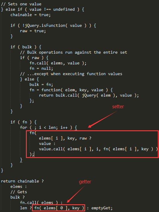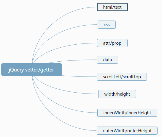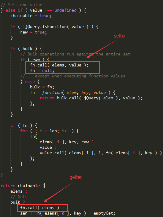 jQuery 的 setter/getter 共用一个函数,通过是否传参来表明它是何种意义。简单说传参它是 setter,不传它是 getter。