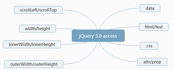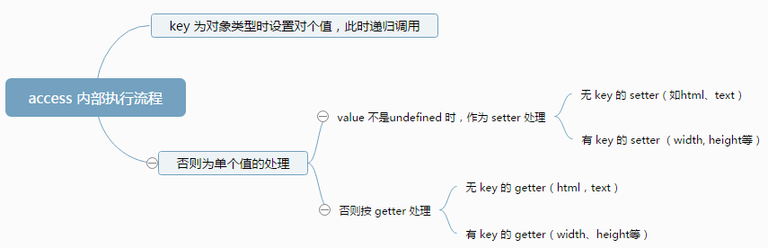 上面提到了 access 是 jQuery 所有 setter/getter 函数的核心,换句话说所有 14 个函数 setter/getter 函数内部都会调用 access。这也是为什么 access 有 7 个参数,里面分支众多。因为它要处理的各种条件就很多呢。但所有这些 setter/getter 有很多类同的代码,最后还是提取一个公共函数。