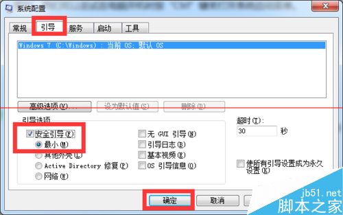 3、从打开的“系统配置”界面中,切换到“引导”选项卡,勾选“安全引导”和“最小化”两个项目,点击“确定”按钮。