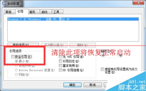 10、接着清除勾选“禁用安全模式”项,这样设置之后就修复了“安全模式”被禁用的情况,通过开机 按“F8”即可进入安全模式。