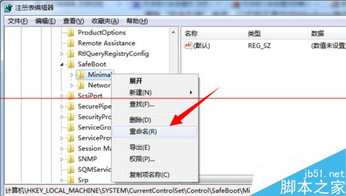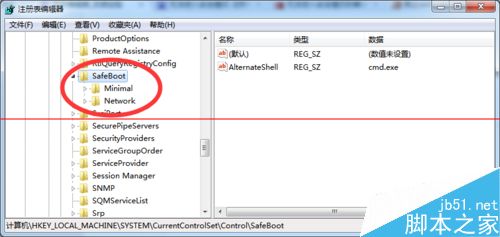 6、从打开的“注册表编辑器”界面中,依次进入“HKEY_LOCAL_MACHINE\SYSTEM\CurrentControlSet\Control\SafeBoot”,在此可以看到“Minimal”及 “Network”项。