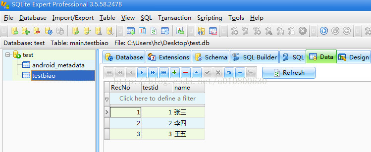 接下来,我们就是要在应用启动的时候读取assets目录下的数据库,然后把test.db写入SDcard的data/data/com.datab.cn路径下边。