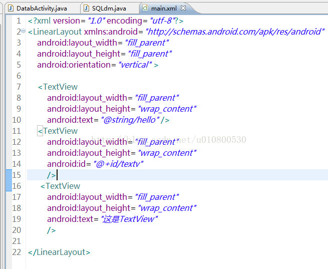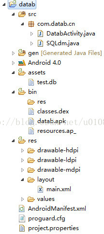 首先,我们建立一个datab的Android Project命名为datab,我们把工程的目录视图贴出来: