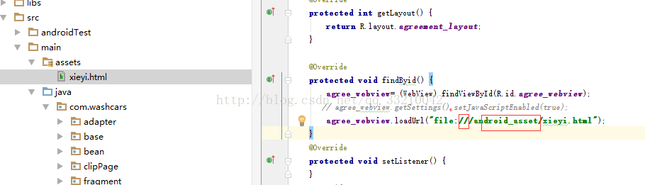 注意事项:file:后面是三个斜杠,后面是android_asset,在后面就是html的名字.