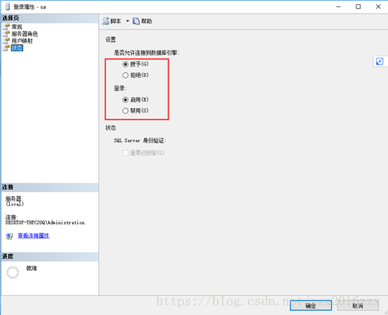 3)在左上角“选择页”中选择“状态”,在右边的设置中,把“是否允许连接到数据库引擎”选择“授予”,“登录”处都选择“启用”,然后单击“确定”按钮。如下图所示:
