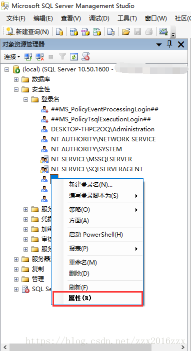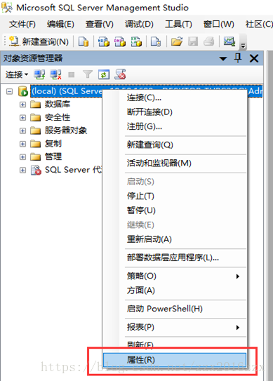 2、 修改服务器验证方式。在对象资源管理器中,右键单击服务器,点击“属性”。如下图所示: