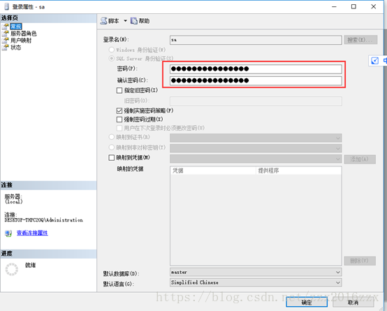 2)在“属性”对话框中,设置sa的登录密码,此处密码设置为“sa”。如下图所示: