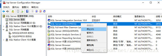 1)在SQLServer Configuration Manager中,点击左侧的“SQL Server 2008R2服务”,在右边的“SQL Server(MSSQLSERVER)”上单击右键,在菜单中单击“停止”。如下图所示: