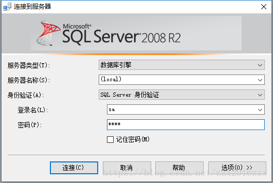 单击开始 –>所有程序->Microsoft SQL Server 2008R2->Microsoft SQL Server Management Studio,重新打开SQLServer2008R2,选择“SQLServer身份验证”,输入用户名和密码。如下图所示: