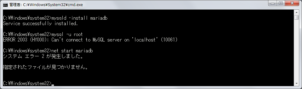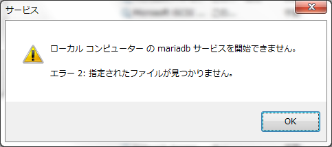 俺用的是日文环境,朋友们就将就将就。翻译一下:发生系统错误,指定的文件没有找到。没有找到????指定什么文件没有找到?好吧,就看看mariadb服务的属性吧。