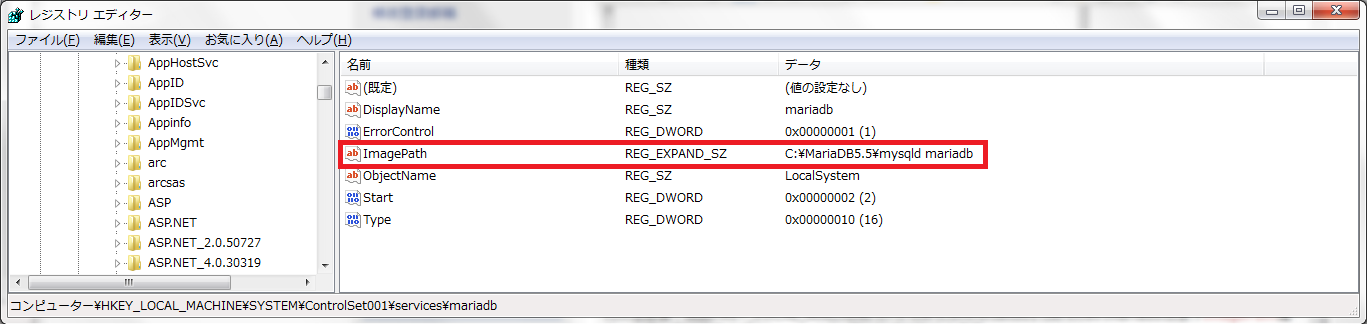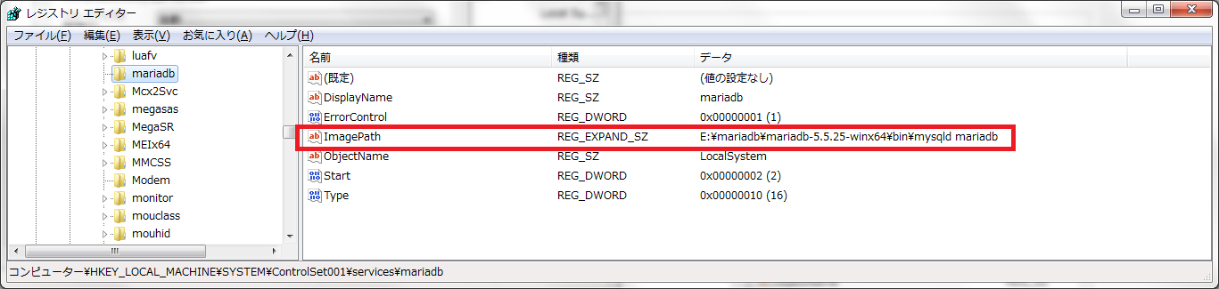 找到之后,修改ImagePath属性为"E:mariadbmariadb-5.5.25-winx64binmysqld mariadb"。现在服务基本就可以启动了。
