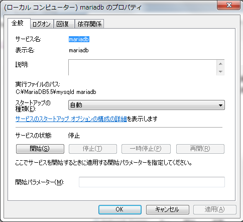 再翻译一下,这个是mariadb服务的属性窗口。[実行ファイルのパス]则是执行文件的路径,即:"C:MariaDB5.5mysqld mariadb";[サービスの状態]则是服务的状态,现在是停止的状态。我们再启动一下看看。
