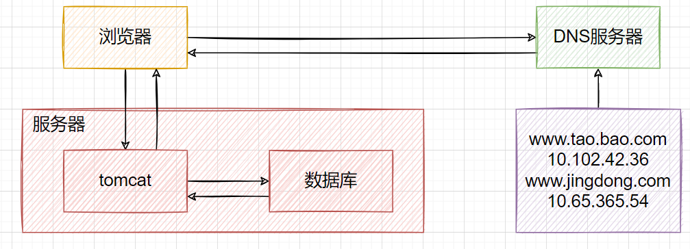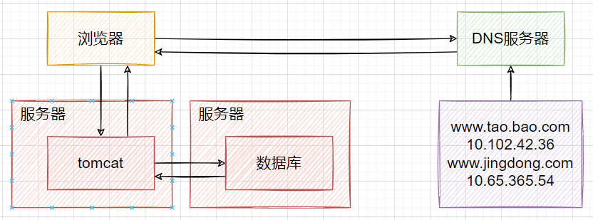 以淘宝作为例子。在网站最初时,应用数量与用户数都较少,可以把Tomcat和数据库部署在同一台服务器上。浏览器往www.taobao.com发起请求时,首先经过DNS服务器(域名系统)把域名转换为实际IP地址10.102.4.1,浏览器转而访问该IP对应的Tomcat。