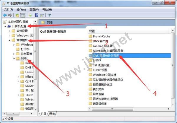 根据图上标注的1、2、3、4步骤找到“QoS 数据包计划程序”