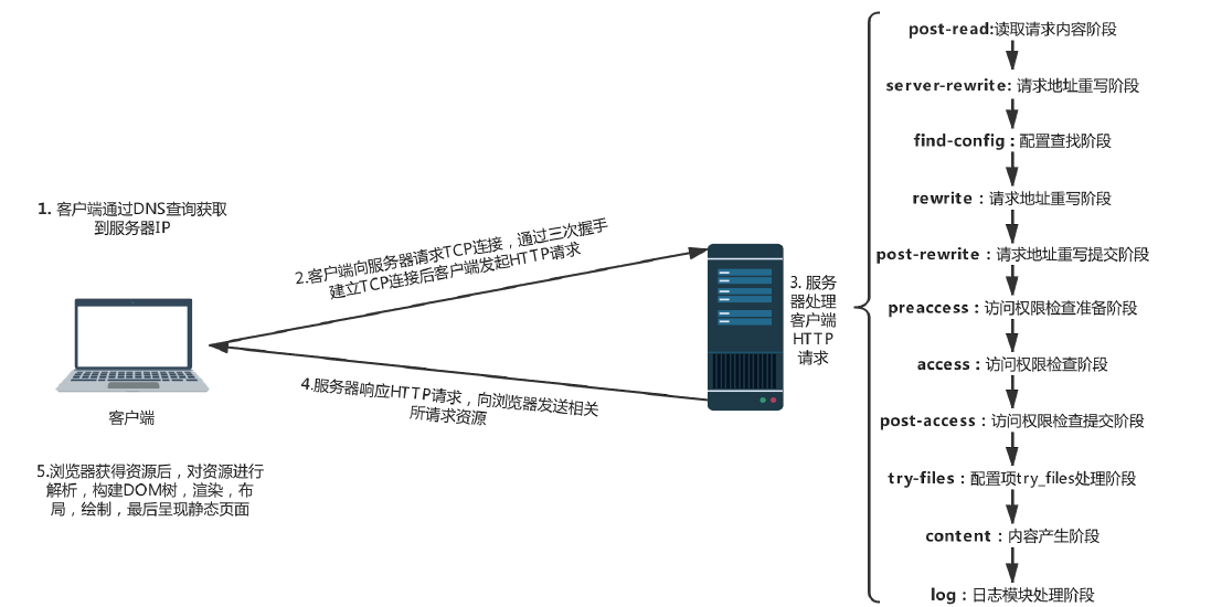 Nginx 处理请求的过程一共划分为 11 个阶段,按照执行顺序依次是 post-read、server-rewrite、find-config、rewrite、post-rewrite、preaccess、access、post-access、try-files、content 以及 log。