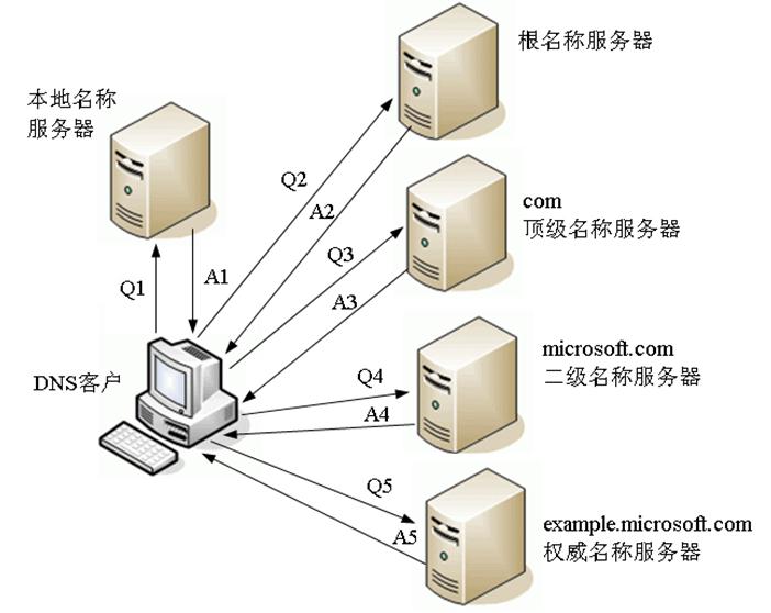 迭代查询:本地域名服务器向根域名服务器查询,根域名服务器告诉它下一步到哪里去查询,然后它再去查,每次它都是以客户机的身份去各个服务器查询。