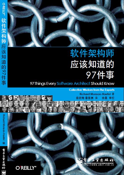 软件架构师是IT 行业里独一无二的职业,既要精通软件开发技术,又要掌握业务知识,还要周旋于公司不同部门之间,协调各种予盾。做到这些绝非易事, 博文视点 即将翻译出版的新书《软件架构师应该知道的97 件事》(97 Things Every Software Architect Should Know )探讨的就是这个主题。