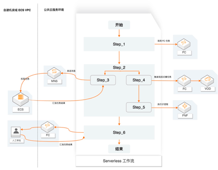 首先我需要将上面用户侧的流程转变为程序侧的流程,此时就需要使用Serverless工作流来担任此任务了。