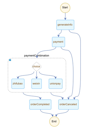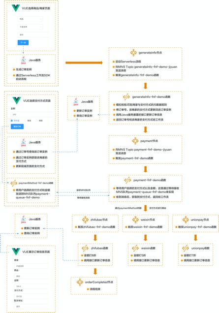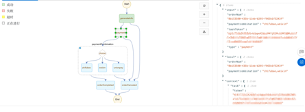 这里的流程是,用户选择支付方式后,通过消息发送给payment-fnf-demo函数,然后将支付方式返回,于是流转到paymentCombination节点通过判断支付方式流转到具体处理支付逻辑的节点和函数。