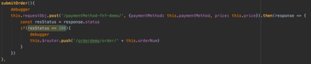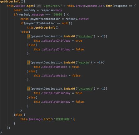 当进入该页面后,会请求Java服务暴露的接口,获取订单信息,根据支付方式在页面上显示不同的支付方式。代码片段如下: