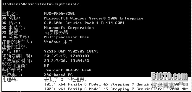 2.在cmd命令中输入“systeminfo”,以下信息表示物理CPU有两个