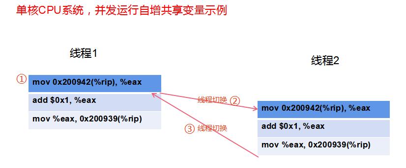 @2:线程1执行完 mov 0x200942(%rip), %eax 指令后,被线程2抢占了。此时需要线程切换,线程切换内核需要保存被换出的线程的上下文(线程ID,栈,栈指针,PC(%rip),条件码,通用目的寄存器(其中就有%[r/e]ax))。一个问题是,如果此时线程1的%eax值是5000,那么经过@2、@3步骤切换回线程1,线程1在执行 add $0x1, %eax 之前,%eax的值是5000还是5001? 这个小问题是整个大问题的关键。