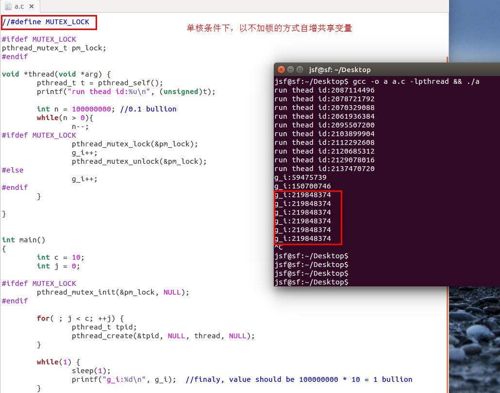 先考虑在多核cpu系统中,无锁情况下,两个cpu可能同时读取 g_i 到各自cpu寄存器,同时在各自寄存器中自增,然后写相同的值到内存;显然这里的自增操作有两次,实际值只是自增了一次,因此不能保证最终的g_i值是10亿。