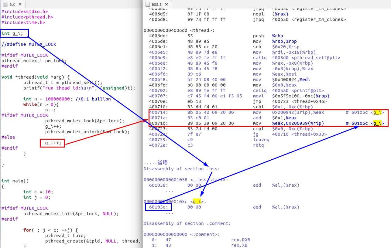 将无锁版的可执行程序反汇编后,如下图所示。从汇编中也可以看到一些规则,比如未经初始化的全局变量,放在虚拟进程空间的 bss 区域. 子线程可以直接访问主进程的 bss 区域,实际上子线程能访问主进程的整个用户虚拟地址空间。包括:代码区域,data区域,bss区域,堆,所有共享库代码。此外,主进程栈空间能被子线程访问吗?实际上也可以通过指针参数传递给子线程来访问。