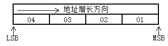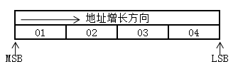 从计算机诞生之后,就有几种不同的字节序,典型的是大端序(big endian)和小端序(little endian),当然还有不常见的混合序(middle endian)。这些用来都是描述多字节数据在内存中的存放方式的。以上面的16进制数0x01020304为例,在计算机中需要用4个字节来保存它,’01’, ’02’,’03’,’04’各占一个字节。按照人类的计数习惯,最左边的’01’,称之为最高有效位(MSB,Most Significant Byte,它具有最高权重);最右边的’04’称之为最低有效位(LSB, Least Significant Byte,他具有最低权重);在计算机中需要用4个字节来保存它,其中’01’, ’02’,’03’,’04’各占一个字节。大端序的计算机保存这个数值时,按照从低地址到高地址的顺序分别保存MSB到LSB四个字节,0x01020304的存储情况如下图所示: