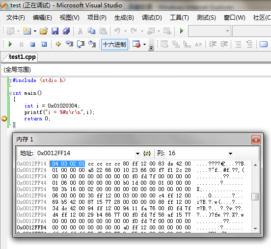 我们可以在VC集成环境中来验证上面的分析。在VS2005中调试下面的小程序,在return语句处设置断点,断住后打开内存窗口查看&i处的内容。可以直观的看到在x86(小端序)的机器上整数的存放方式。