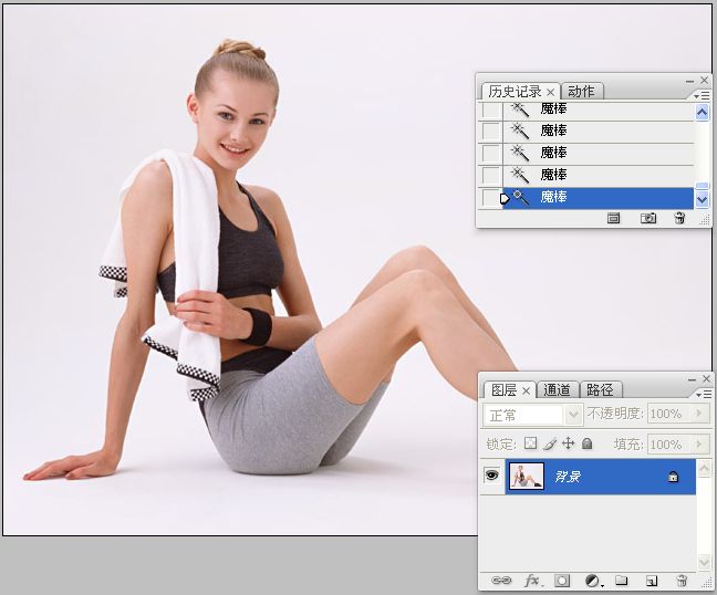 1、选择魔棒工具,将容差设置为10,按住SHIFT在人物素材的背景上连续单击,直到将背景全部选取。按下SHIFT+CTRL+I快捷键将人物反选。