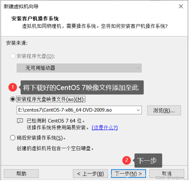 5、选择安装程序光盘映像文件,点击浏览,找到开始所下载的CentOS映像文件,点击下一步