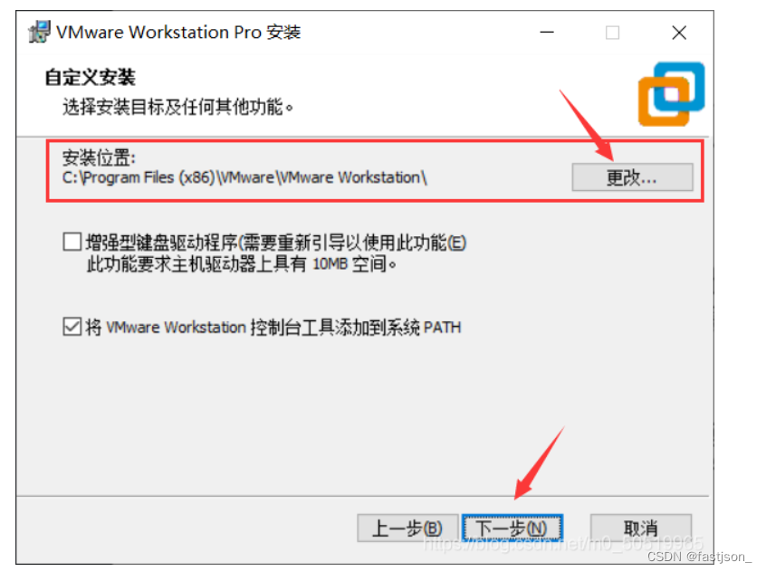 4、选择软件安装路径,默认安装在C盘,点击更改可修改安装路径,注意:安装路径文件夹名称均不能含有中文字符!这里我将软件安装在E盘Vmware文件夹下,然后点击下一步