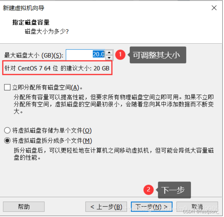 13、磁盘容量,建议选择20GB,下一步
