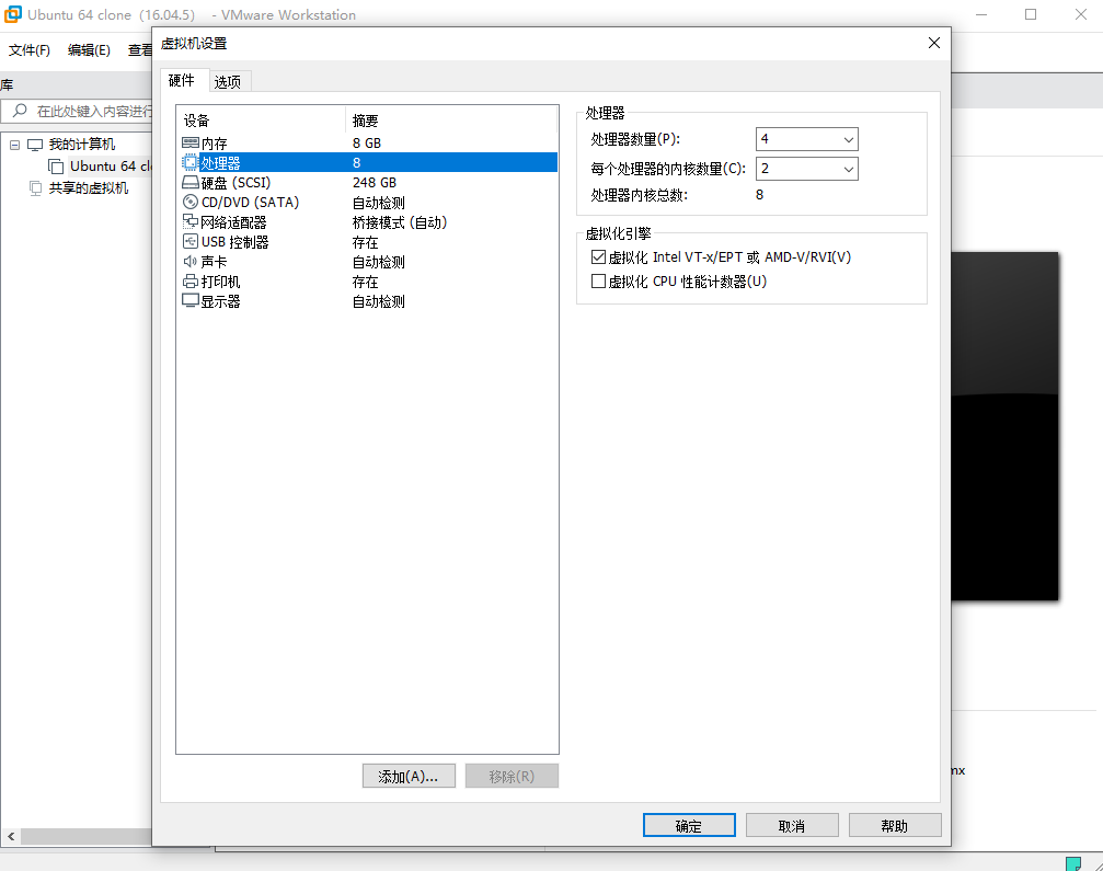 测试有两组变量,一个是虚拟机CPU设置策略,一个是Ubuntu装在机械硬盘或固态硬盘,而m.2硬盘就不测了。内存都是分配8G,每次测试采用控制变量法。