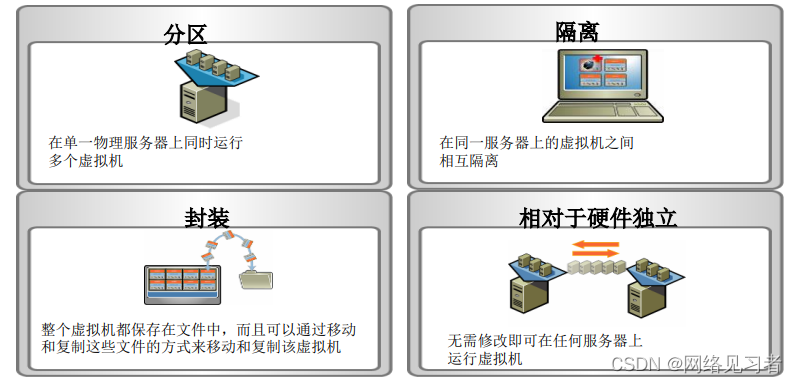虚拟机的优势:分区、隔离、封装、相对硬件独立