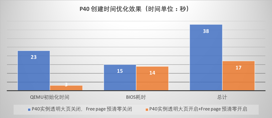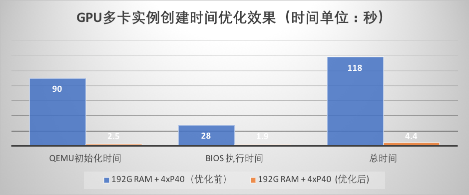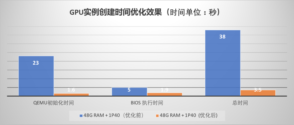 在解决完上述问题后我们并没有止步,对虚拟机实例创建过程中的可优化的其它地方,我们也做了相关的处理,例如关闭BIOS boot menu ,优化VFIO PCI 设备reset 的流程,去掉对GPU实例来说不必要的操作,最终将GPU实例创建过程中虚拟化部分的时间开销减少了90%以上,下面这张图展示了单卡小内存规格实例优化前后的耗时对比: