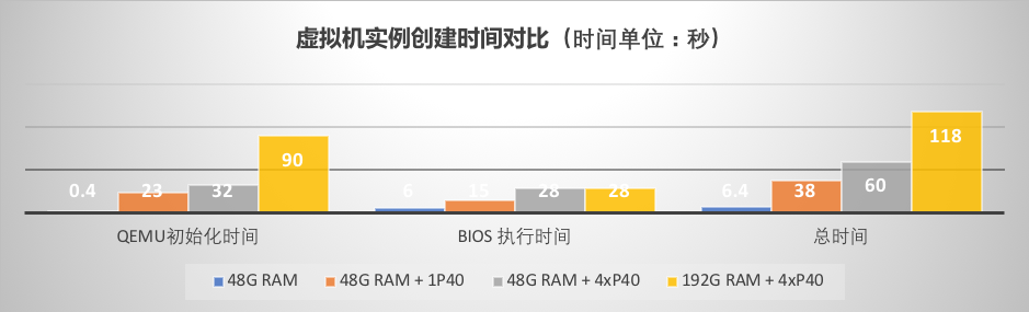 从上面的数据可以看到,对于规格相同的虚拟机实例,带1块P40卡的GPU实例相比同规格的CPU实例在QEMU初始化及BIOS执行部分的时间都明显要长, 在带4块P40卡以及更大内存规格的场景下,需要的时间会进一步拉长。通过实验我们发现在主机配置和GPU卡型号确定的前提下,GPU实例的创建时间长短主要取决于两个因素:虚拟机的内存大小和GPU卡的数量。