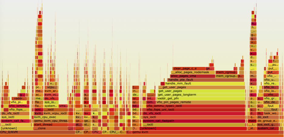 为什么GPU实例的创建过程要比CPU实例的创建过程耗时长?多消耗的时间到底花在哪里?要搞清楚原因需要深入的分析,比较直观的办法就是通过perf采样来生成火焰图,以此来分析虚拟机在创建过程中的热点函数。下图是在滴滴云环境里抓取到的GPU虚拟机启动过程中QEMU进程的火焰图。