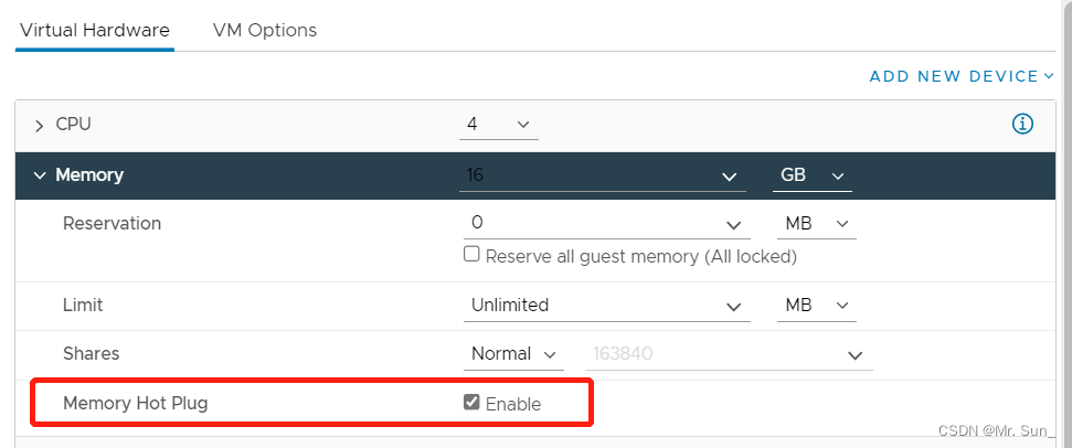 在配置Memory的时候,勾选Enable Memory Hot Plug ,这样就可以在线添加内存而不用关机虚拟机了。