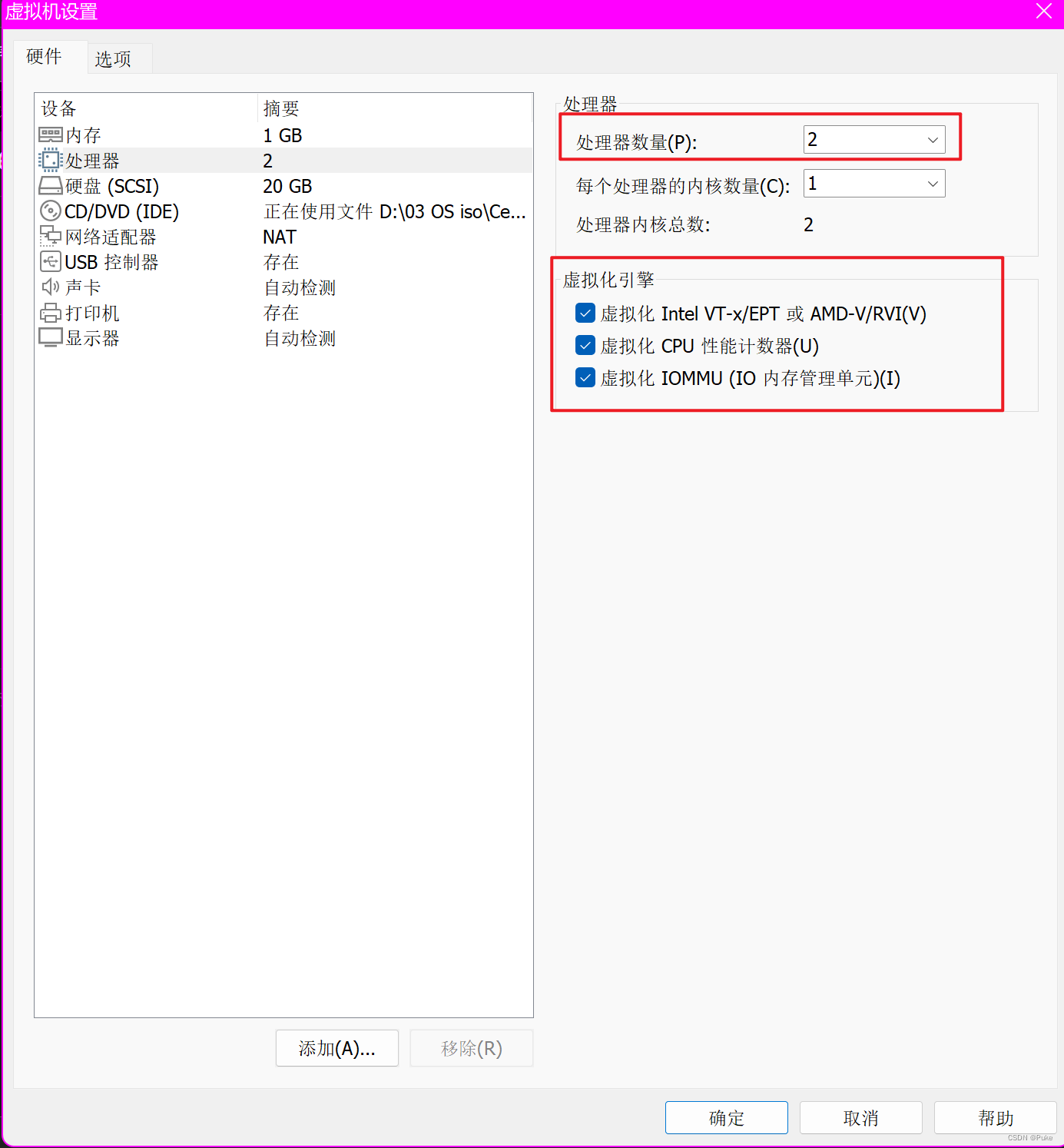 后续又继续百度,修改了处理器的虚拟化设置,把红框内的CPU数量从1改为了2。虚拟化引擎3个选项都勾选上。