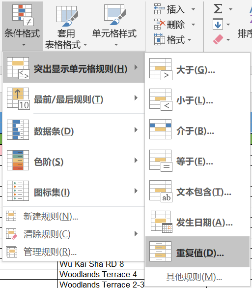 开始 -> 条件格式 -> 突出显示单元格规则 - > 重复值
